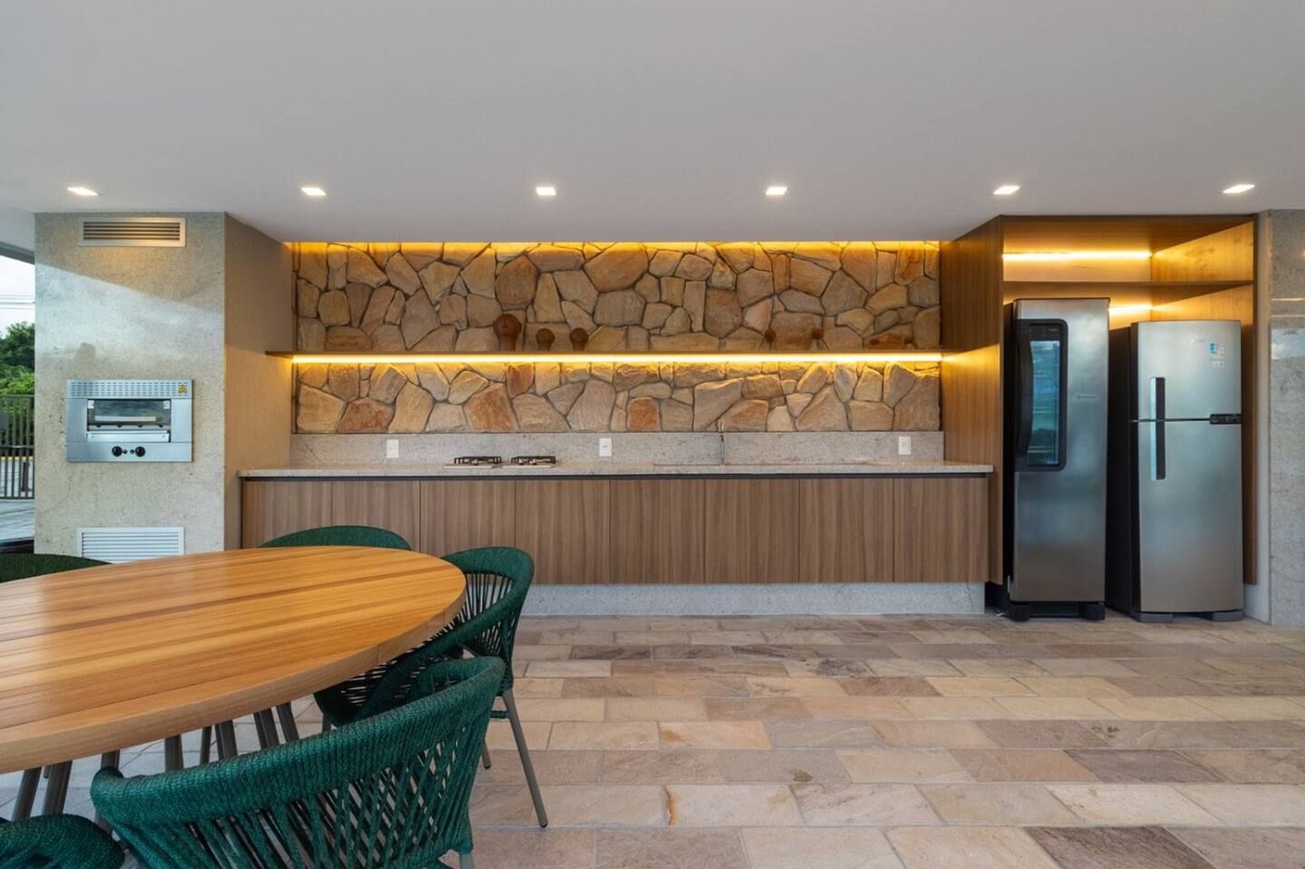 • Geladeira, cooktop, micro-ondas, cafeteira, air fryer, sanduicheira e todos os utensílios necessários para preparar refeições com praticidade.