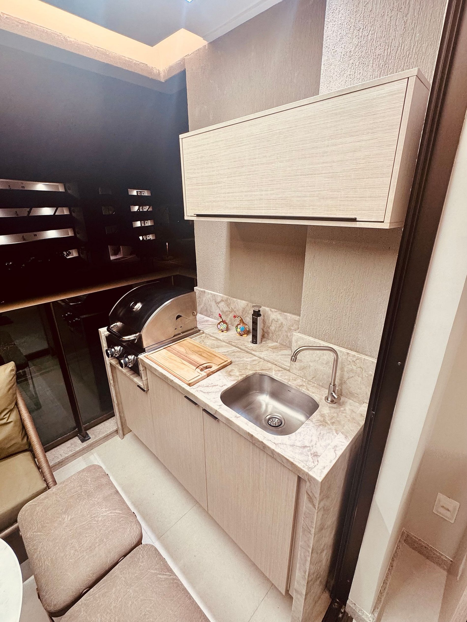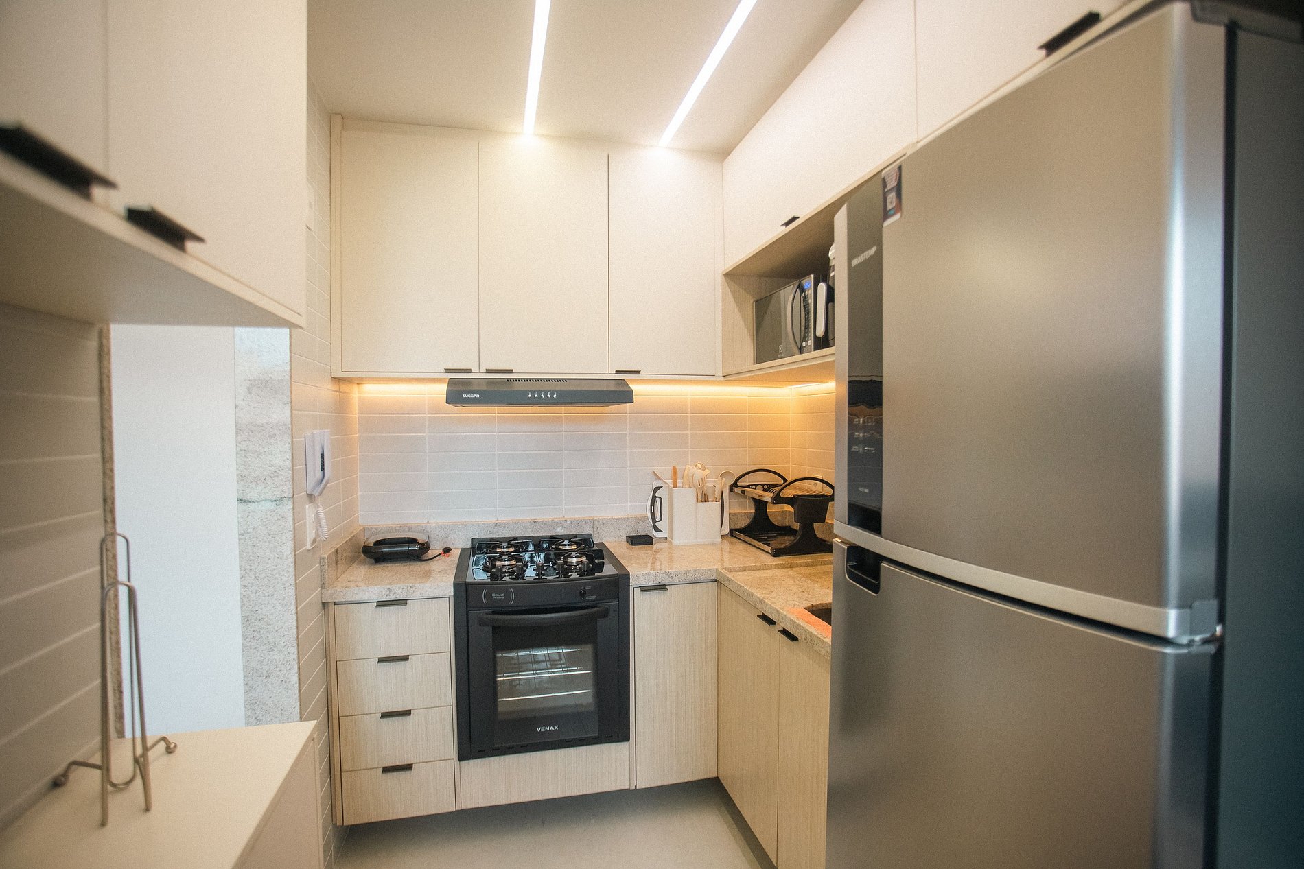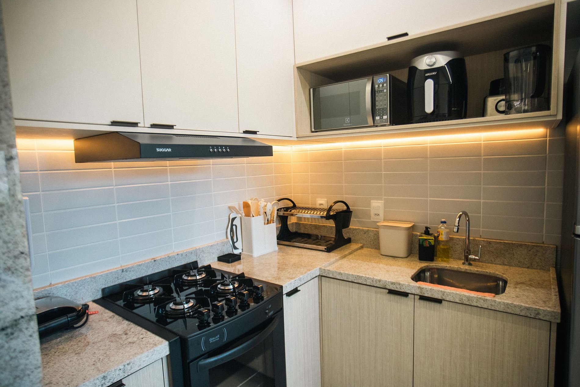 • Geladeira, cooktop, micro-ondas, cafeteira, air fryer, sanduicheira e todos os utensílios necessários para preparar refeições com praticidade.