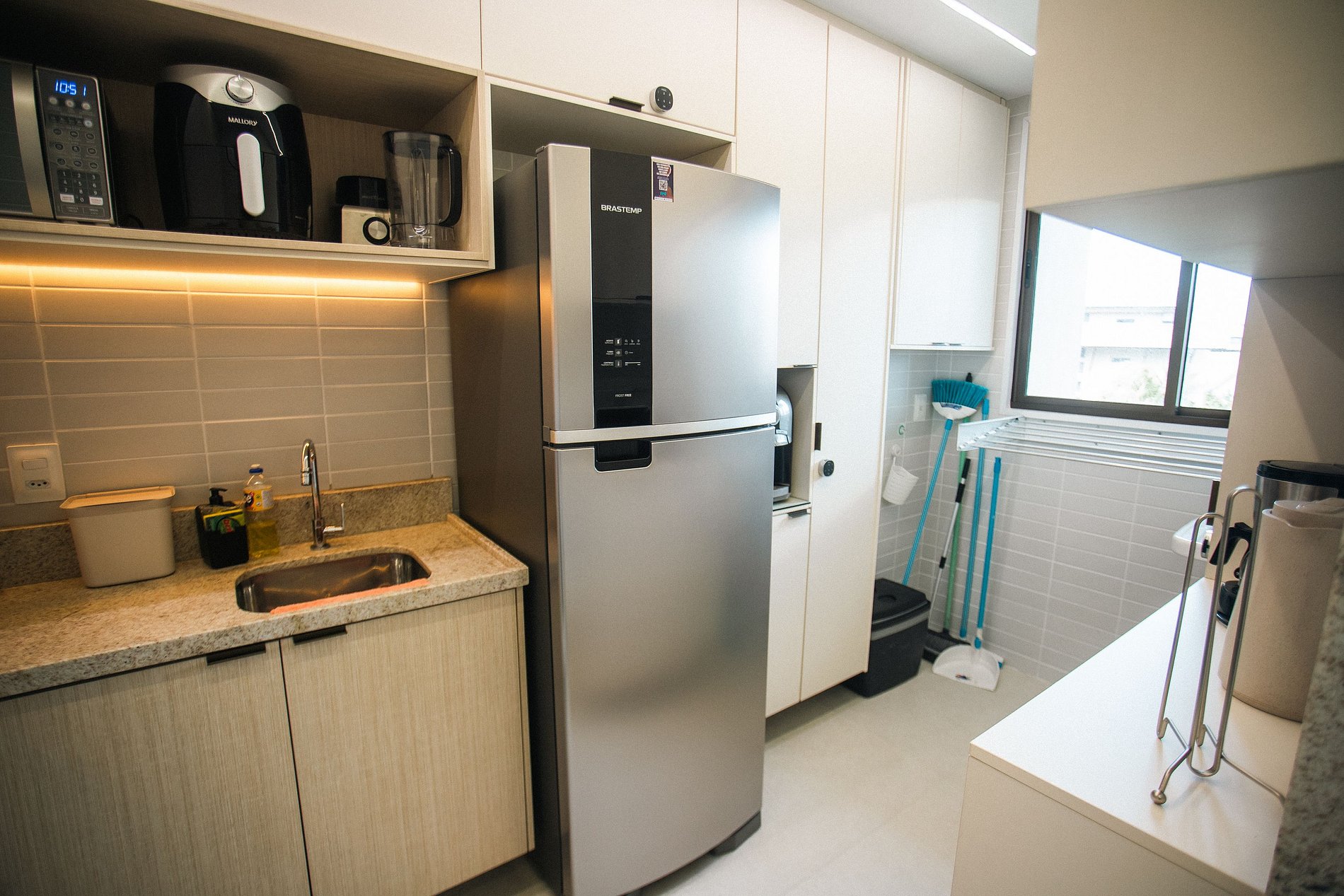 • Geladeira, Fogão Cooktop, Micro-ondas, Cafeteira, Air Fryer, Sanduicheira e todos os utensílios necessários para preparar refeições com praticidade.