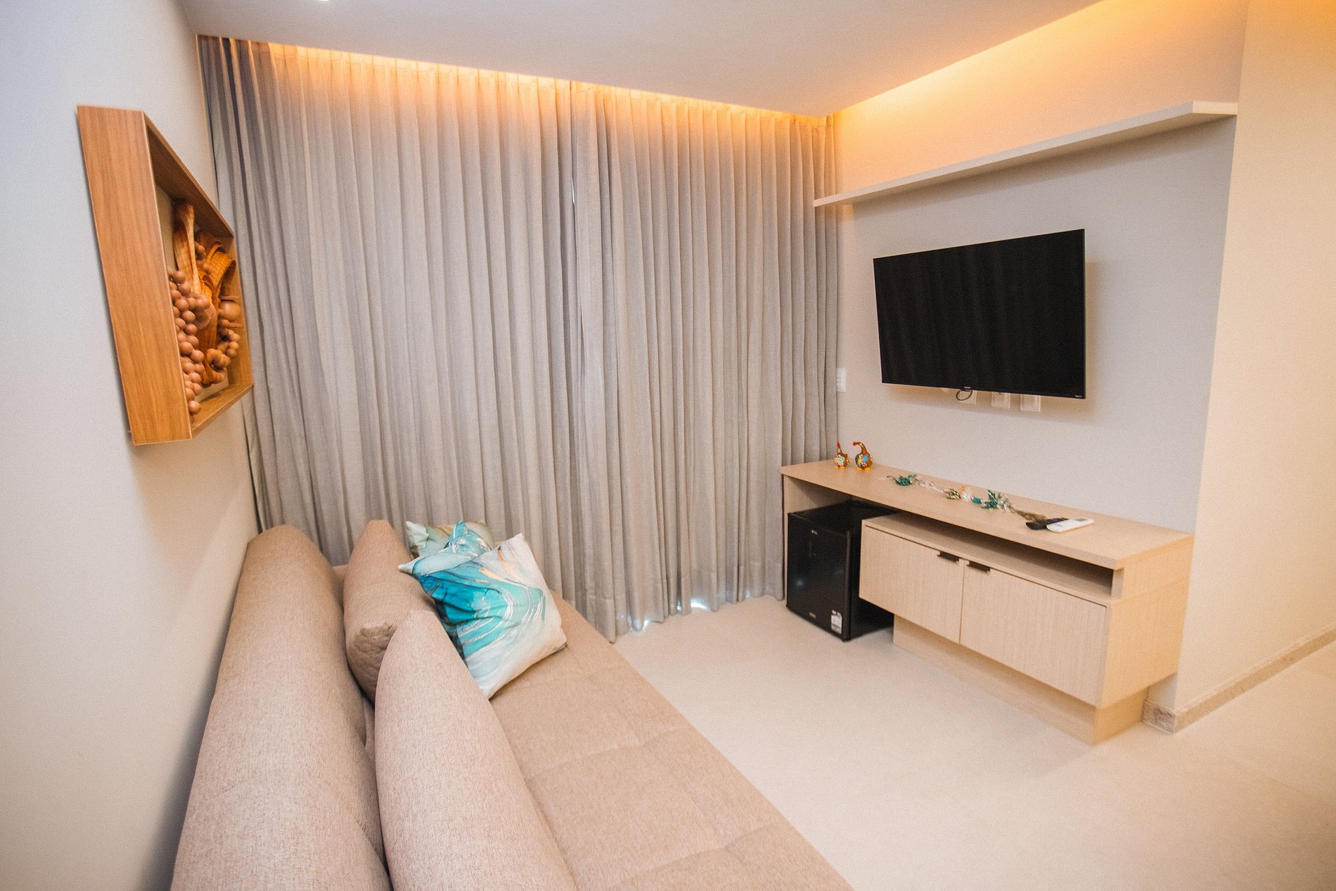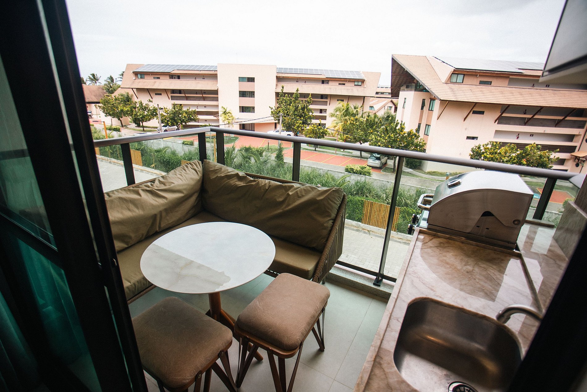 A sala é climatizada, acolhedora e bem decorada – ideal para relaxar após um dia de sol. A varanda convida ao descanso, enquanto a cozinha equipada garante liberdade e praticidade durante toda a estadia. Os quartos contam com ar-condicionado e cortinas blackout, oferecendo total conforto térmico e privacidade.