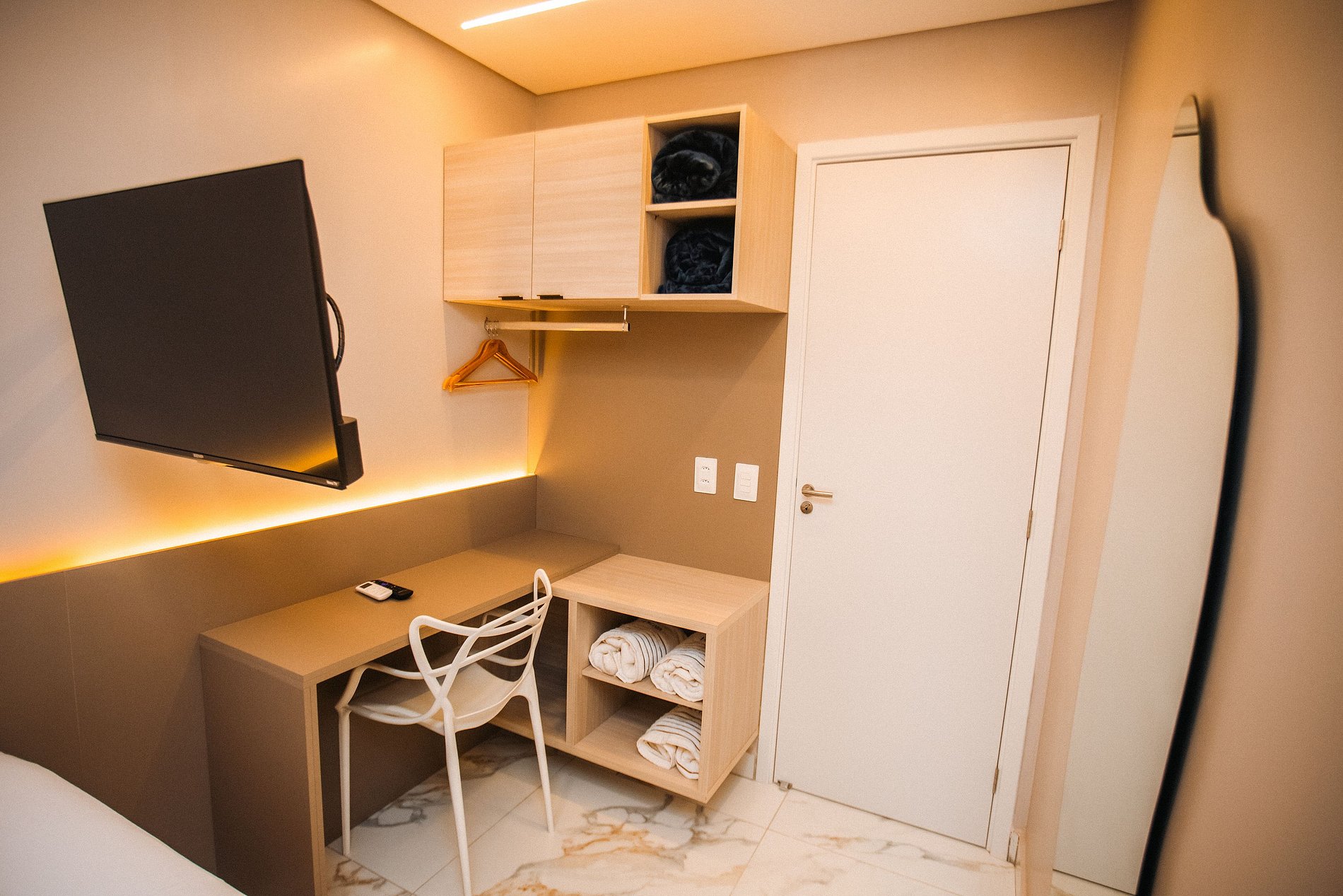 O grande diferencial é equilíbrio entre funcionalidade e experiência sensorial: decoração clean, iluminação aconchegante, móveis funcionais e espaços inteligentes — tudo isso em um flat com estrutura completa, Wi-Fi estável, cozinha equipada, quartos silenciosos e rooftop com vista privilegiada.