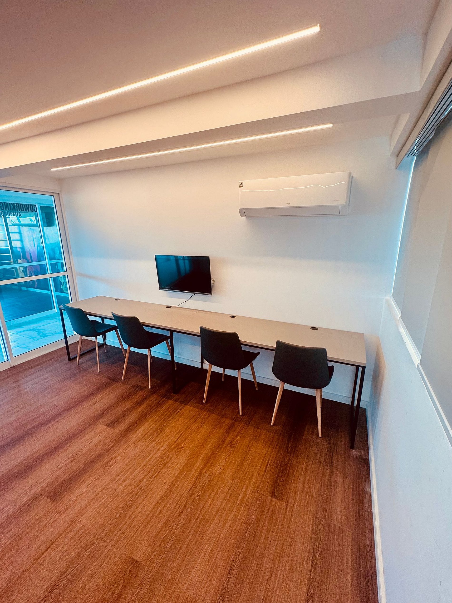 No quarto, há uma bancada funcional para home office, ideal para nômades digitais ou quem precisa de um espaço tranquilo para produtividade.