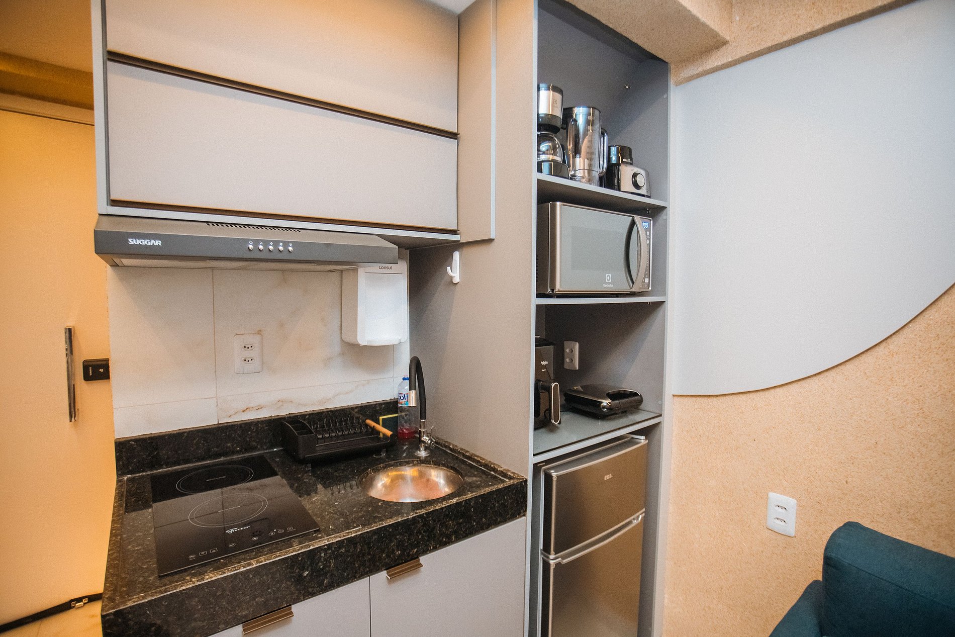 O Wi-Fi tem excelente desempenho e cobre todo o apartamento. A cozinha é equipada com eletrodomésticos essenciais, como geladeira, cooktop, micro-ondas, cafeteira, sanduicheira, além de utensílios completos e enxoval de cama e banho.