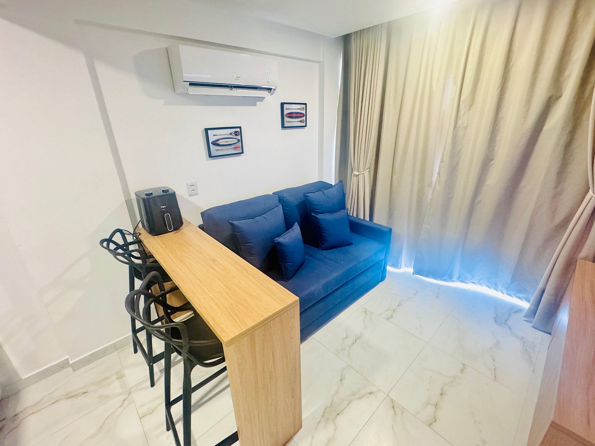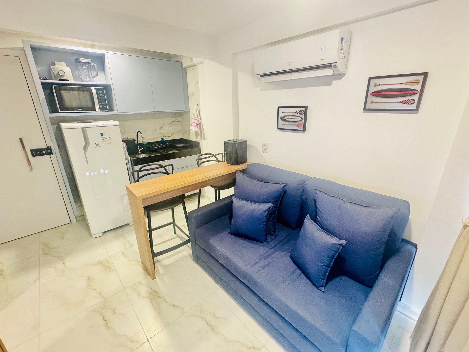 Cada detalhe contribui para a estadia — iluminação aconchegante, ambiente climatizado e bancada de home office. A decoração é clean, inspirada no litoral, transmitindo paz e bem-estar.